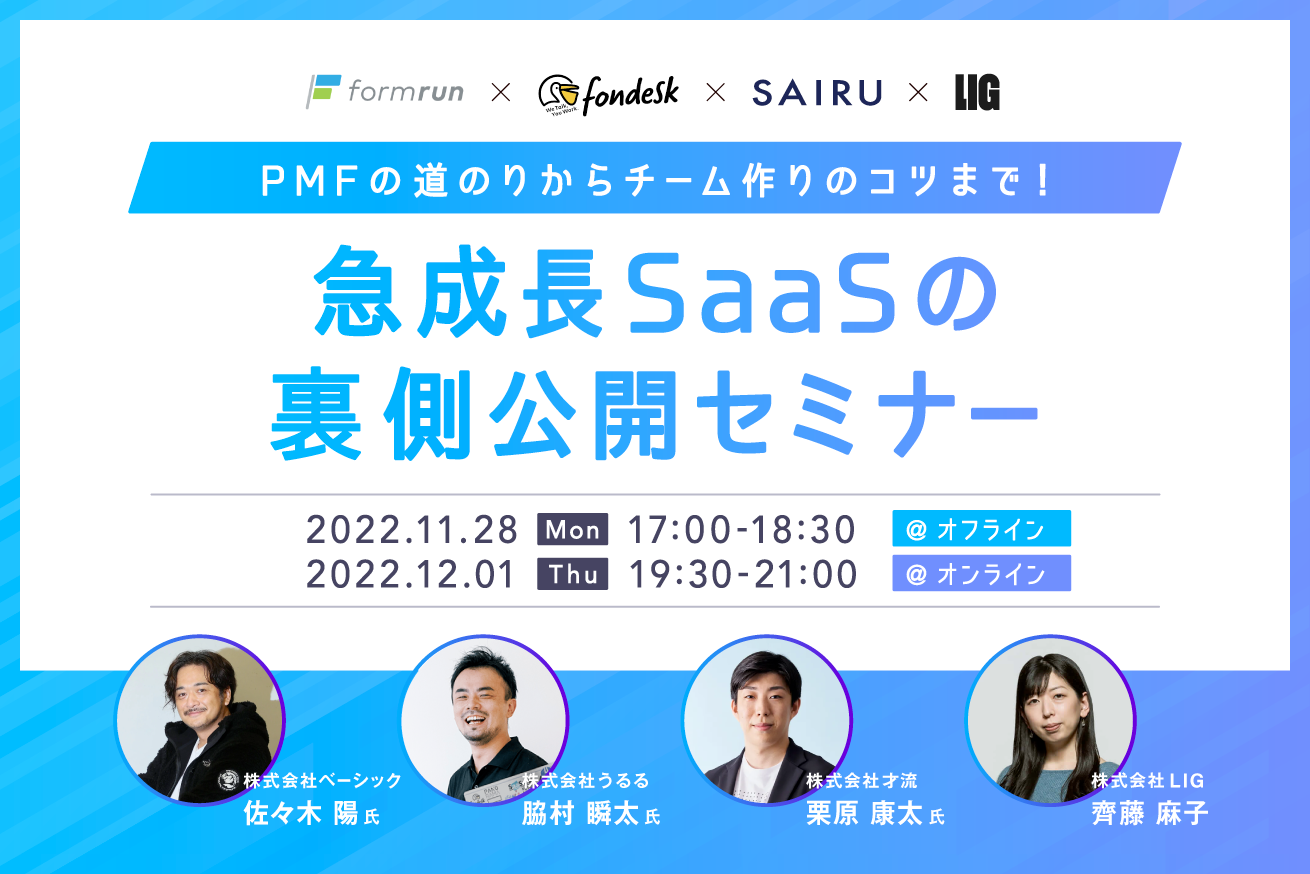 「formrun」や「fondesk」に加え、才流が支援してきたSaaSサービスをもとにした成功事例を中心に、実際にPMFを達成するまでの過程や、チーム作りのコツなど、“急成長SaaSの成功の裏側”について、本セミナーを通して公開いたします。セミナーは、11月28日のオフライン開催後、12月1日にオンラインでも開催します。