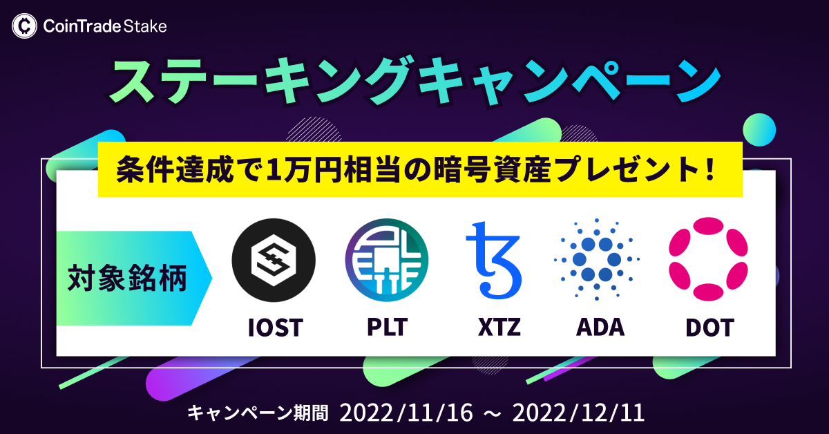 また、「CoinTrade」(コイントレード)では第3弾ステーキングサービスリリースを記念して、5万円以上の取引かつステーキングのお申込みで、最大10,000円相当の暗号資産をプレゼントするキャンペーンを開始いたします。