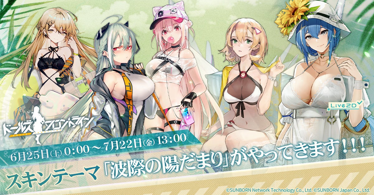 今年も夏を楽しむ為にとっておきの水着を用意したキャラクター達の新スキンテーマ「波際の陽だまり」が「6月25日(土)0:00」よりゲーム内に追加されます。