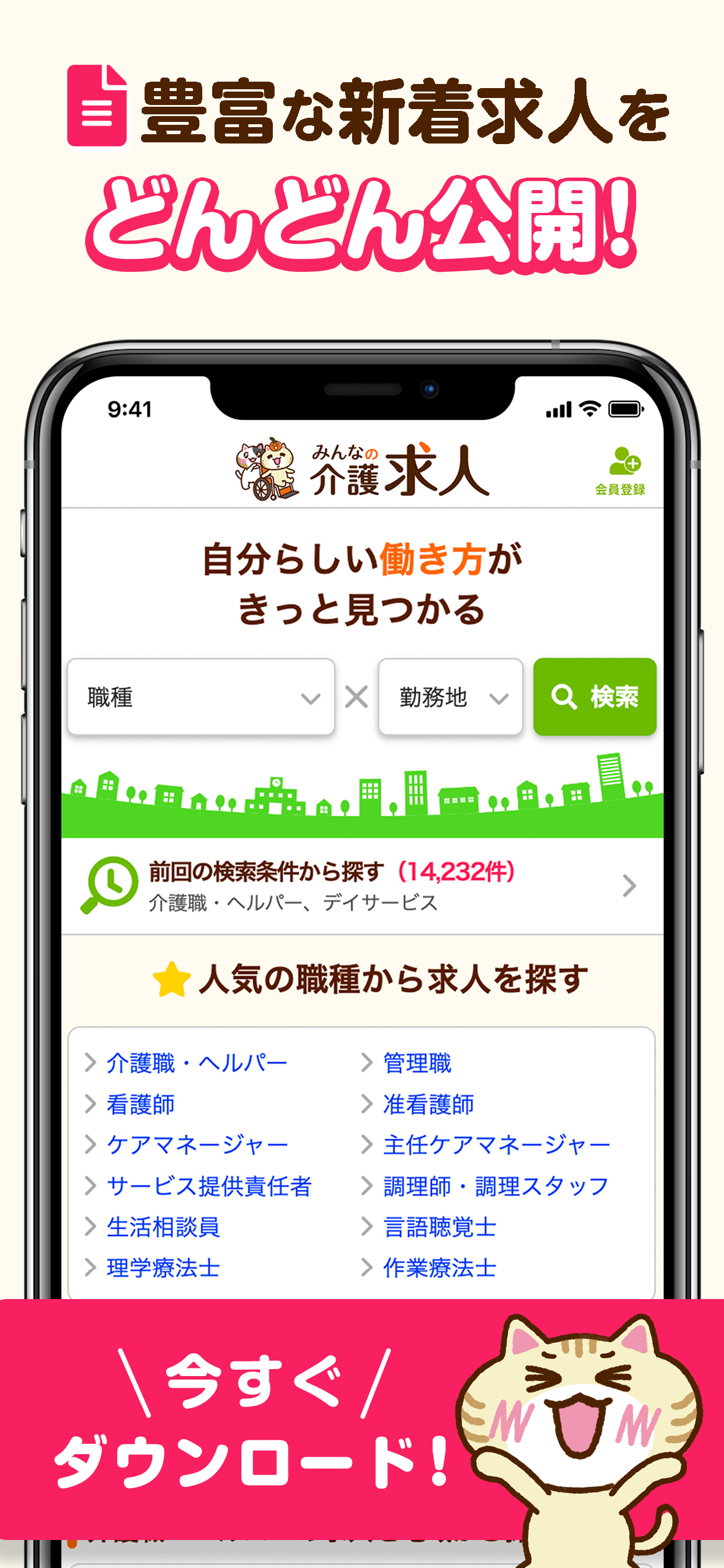 介護福祉士・ヘルパー・ケアマネ・看護職など、介護業界に関わる皆さんの転職をサポートするために必須の機能を完全網羅!理想の働き方を実現するため、介護に関わる全ての方にご利用いただきたいアプリです。もちろん、iOS・Andoroidいずれのスマートフォンでもご利用頂けます。