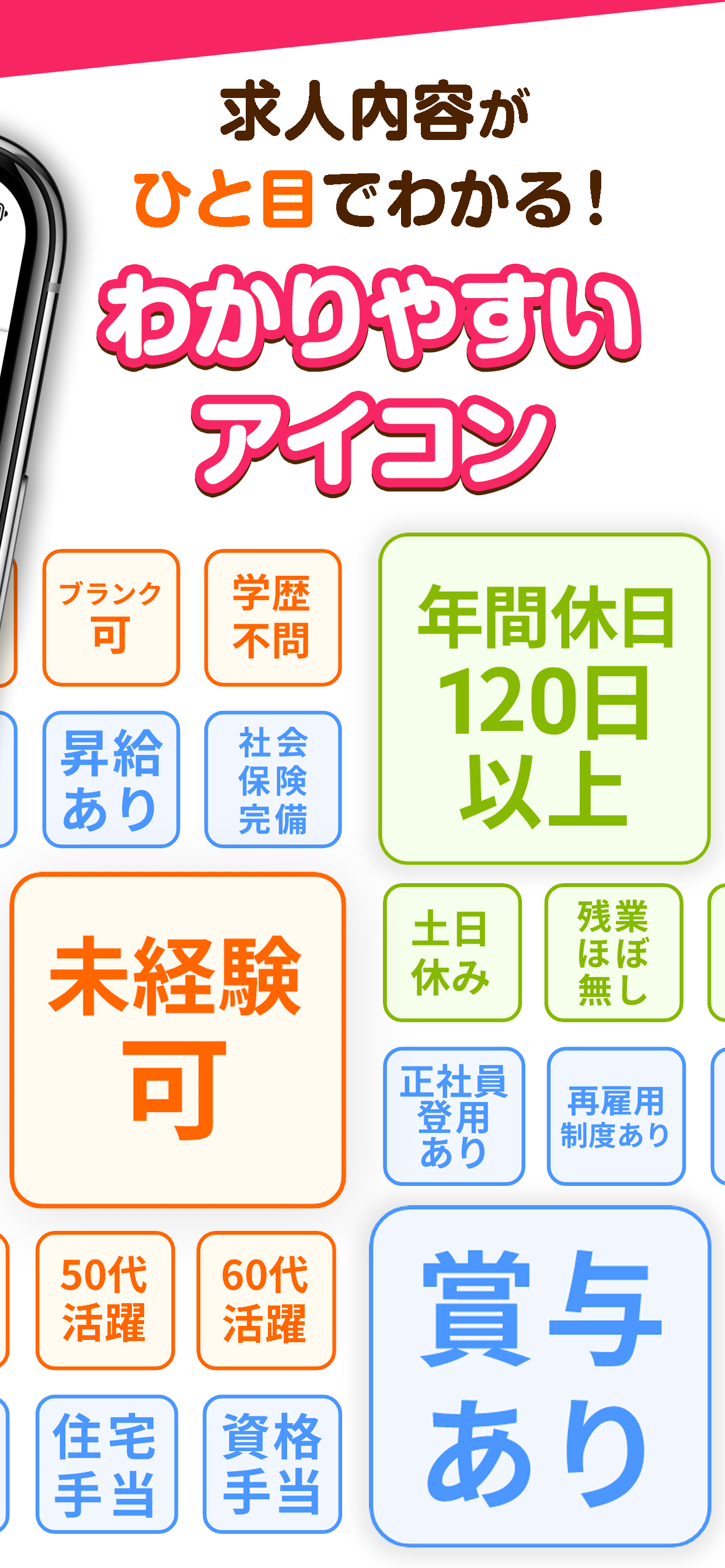 ・求人内容をわかりやすいアイコンで表示!ひと目で求人内容がわかります!