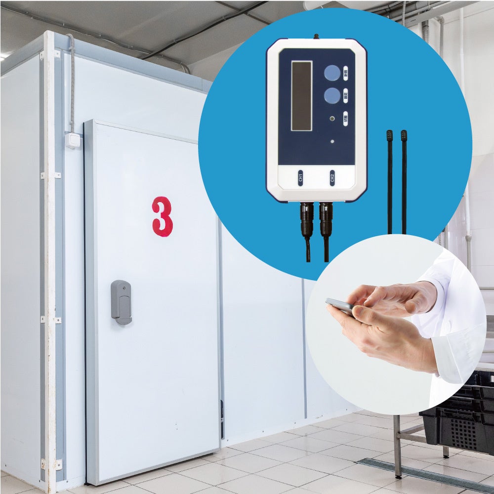 食品工場や倉庫の温度を自動記録。広い建屋やコンテナ冷蔵庫、冷凍設備にも設置可能。温度記録を自動化、監視して異常時は通知します。新たに機器の異常を遠隔から把握し管理する警報通知機能をサポート。