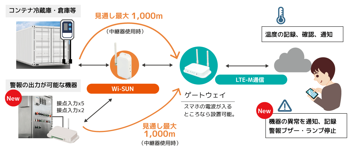 - ゲートウェイ-温度センサー/ユニット間はWi-SUN接続、最大500m(見通し)