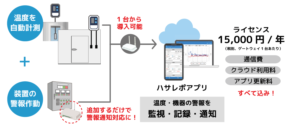 複数台の機器に警報通知機能を導入しても、運用費はゲートウェイ1台あたり年額15,000円(税別)。本価格には、通信費、クラウド利用料、アプリ更新が含まれています。