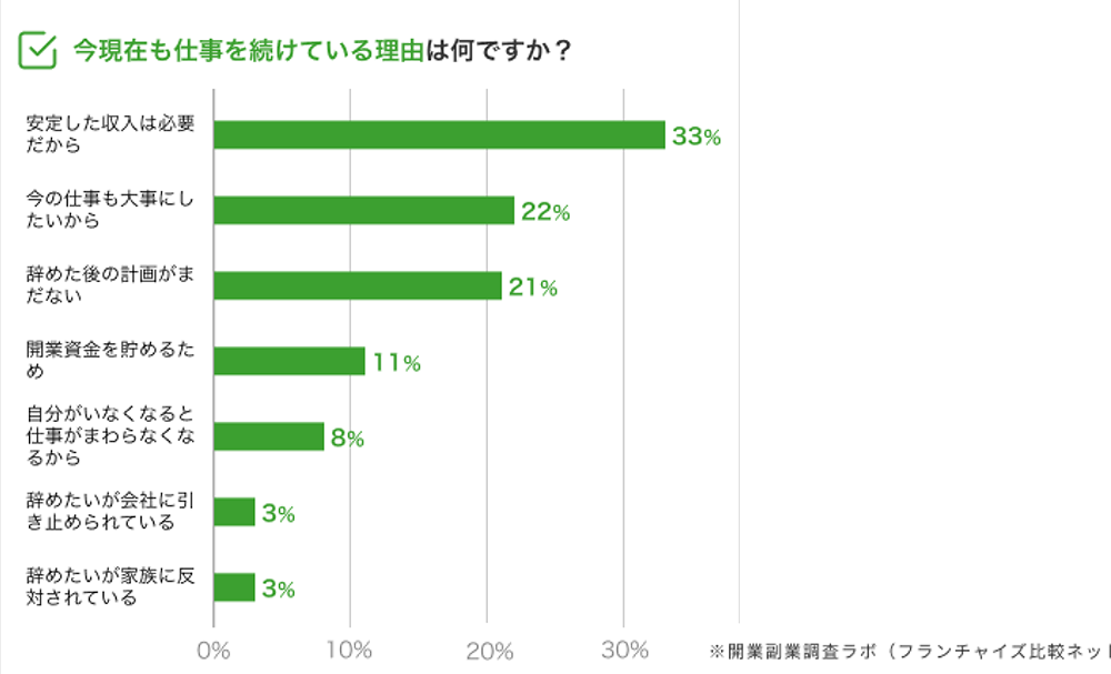続いて、 不安・不満を抱えながらも現職を続けている理由を尋ねたところ、「安定した収入は必要だから」が3割を超えました。「今の仕事も大事にしたい」という理由以外は、いまだ今後の見通しが立たず、お金が足りないから続けているという回答が目立ち、収入面の不安と不満が、副業(兼業)や開業検討のきっかけになっていると考えられます。