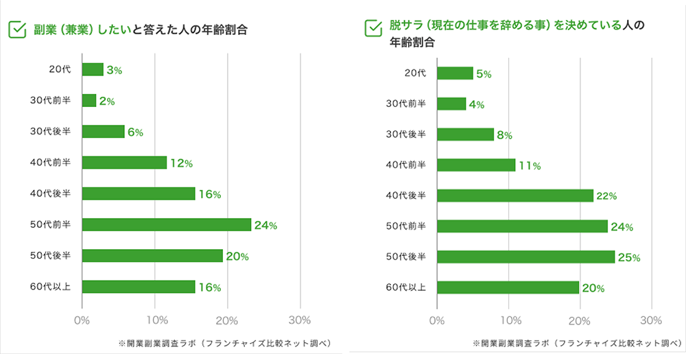 一方で、副業ではなく脱サラ(完全な独立)を希望する人のデータを見ると、50代だけで全体の4割を占めます。副業希望者は30代後半から徐々に増えていますが、脱サラ希望者は40代後半から急速に増え始めています。大学卒業後20代前半から65歳の年金受給開始まで働いた場合、40代後半はちょうど社会人折り返しに入るタイミングです。副業よりも脱サラをして、大きく働き方を変えながら残りのキャリアを構築したいと考える人が増加していると推察されます。