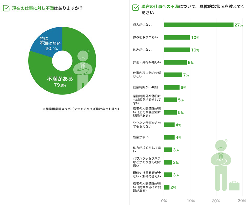 コロナが徐々に落ち着き人の動きが活発化しているなか、2022年度の東証プライム上場企業の夏季ボーナスは、前年同期比で6.5%増となりました。前年比マイナス2.5%となった昨年度と比較すると、コロナショックから立ち直りを見せています※1。一方、このたびの「開業副業調査ラボbyフランチャイズ比較.net」の調査によると回答者の95%は現職に不満を感じており、収入の少なさが副業(兼業)の後押しとなっていることがわかりました。本レポートでは、現在仕事をしていて開業・副業を検討中の231名にアンケートを実施し、「副業を検討したきっかけや副業開始にあたり重視していること、不安なこと」」について分析した結果をご紹介いたします。