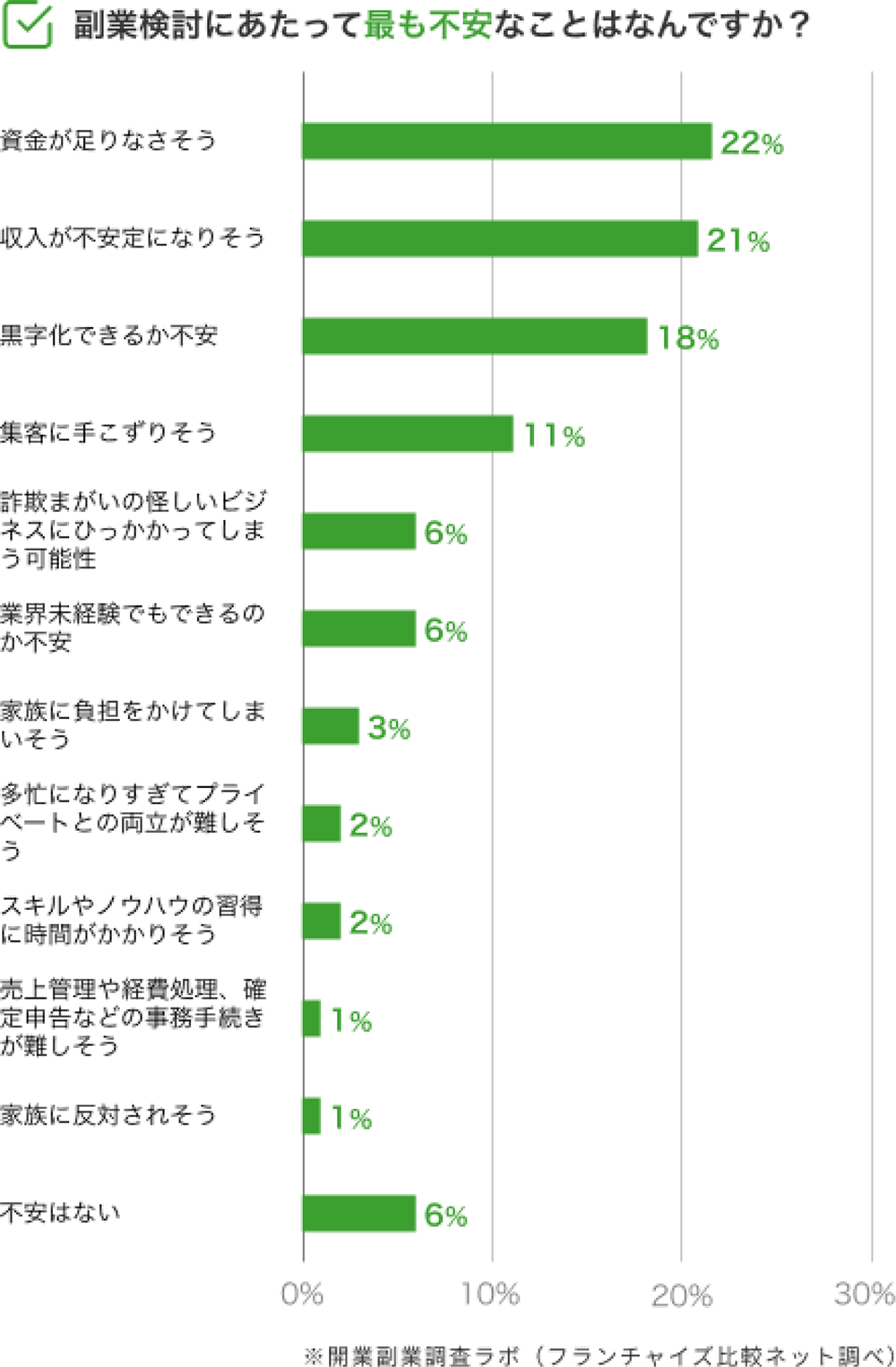 類似した質問で、副業(兼業)検討にあたり重要なポイント13個のうち当てはまるもの全てを回答した結果を見てみると、優先順位の低い項目が浮かび上がりました。「短期間でノウハウを獲得できるか」と「法人化や複数店舗経営などの成長が見込めるか」は4%、「競合に負けない特色があるか」は3%と、短時間で利益を上げるのではなく着実に稼ぎたく、事業の成長性やオリジナリティのプライオリティは低いということがわかりました。