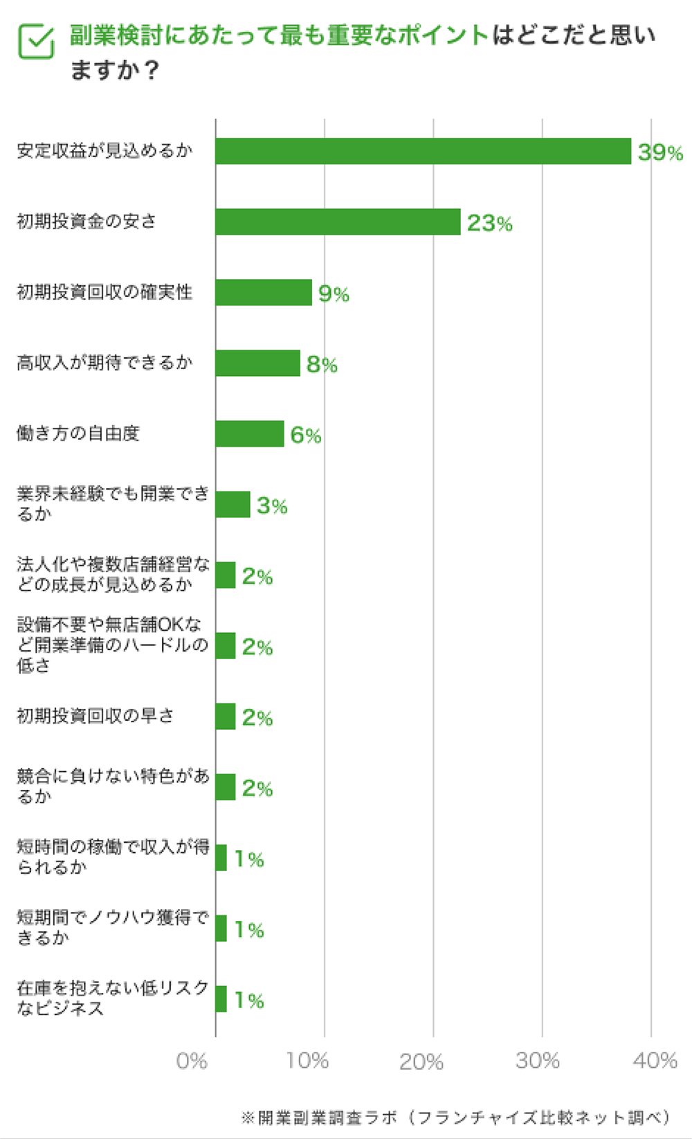 また、副業(兼業)を検討するにあたり重要なポイントを尋ねた結果、「安定収益が見込めるか」が39%、「初期投資金の安さ」が23%となり、再び収入に関する項目が63%と過半数を超えています。これまでご紹介した調査データから、現職の収入に満足しておらず開業したくてもまとまったお金がない、さらにどんな仕事で副業していくか決まっておらず、今すぐ仕事を辞められないという人が副業を検討していると想定できます。あまり余裕がない現状から、副業するならとにかく安定収入で、リスクの少ない働き方を希望する人が多いと考えられます。