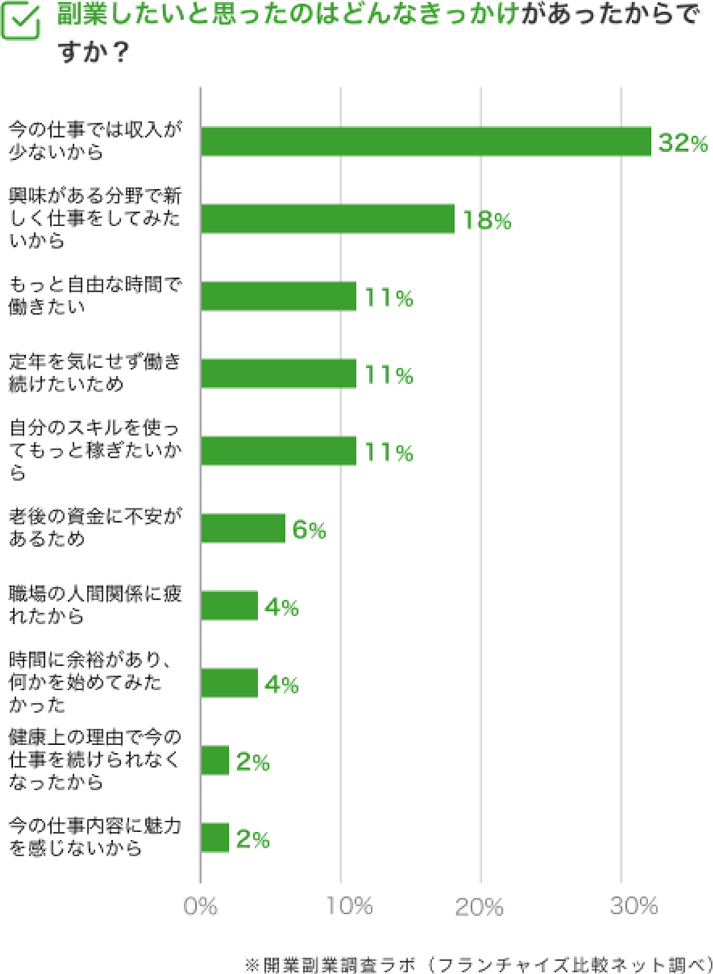 副業(兼業)を検討するきっかけについて調査したところ、「今の仕事では収入が少ないから」が32%の1位となりました。この項目に加えて「老後の資金に不安がある」、「自分のスキルを使ってもっと稼ぎたい」を合わせると49%となり、全体の半数を収入関係の項目が占めています。その他の理由としては、「興味がある分野で新しく仕事をしてみたい」が18%、「もっと自由な時間で働きたい」と「定年を気にせず働き続けたい」がともに11%でした。好きな仕事・場所で働きたいといった自由度やチャレンジよりも、前述の通り現職の収入不安から現実的に稼ぎを増やしたい意向が非常に強いことが伺えます。