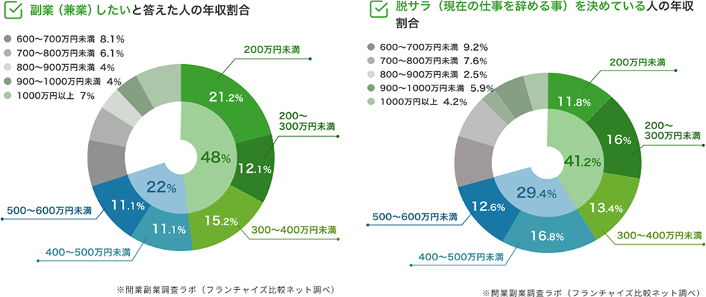 脱サラ希望者と同じく、「好きな仕事にチャレンジしたい」、「自由気ままに副業でノマドワークしたい」といった人よりも、地に足をつけてリスクなく副業をしたい、副業するなら積極的に労働時間も増やして現年収を大きく超えていきたいと考えていることが推察されます。