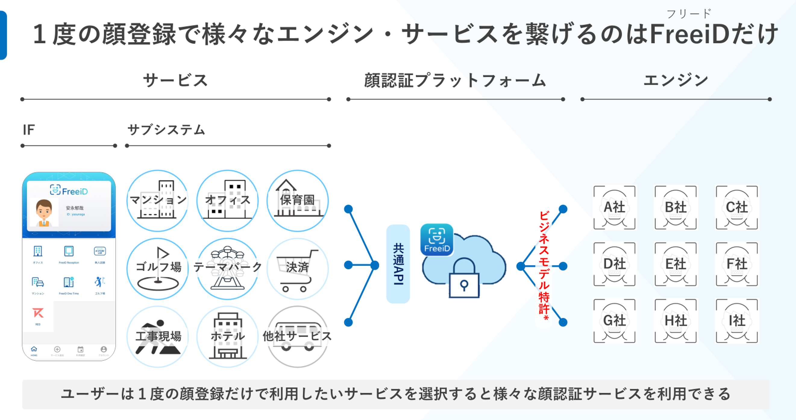 これまでの顔認証サービスは、ユーザーアプリや管理システムがそれぞれで異なり、利用場所ごとに顔の登録が必要でした。FreeiDは多種多様な “顔認証エンジン”と連携することが可能であり、1度の顔登録で様々な顔認証サービスを利用*することができます(特許第 6839313号ほか)。