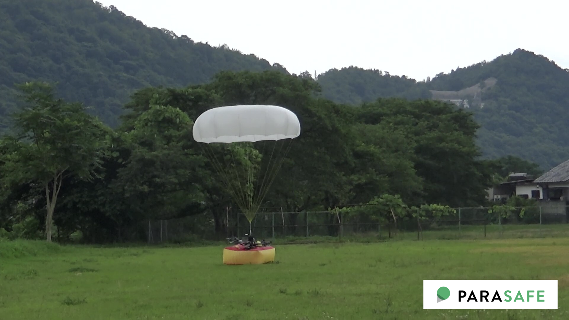 ・産業用ドローン向け緊急パラシュートシステム「PARASAFE」を搭載したドローンを落下させ、パラシュートとエアバッグによって落下衝撃を緩和できる効果を確認します。
