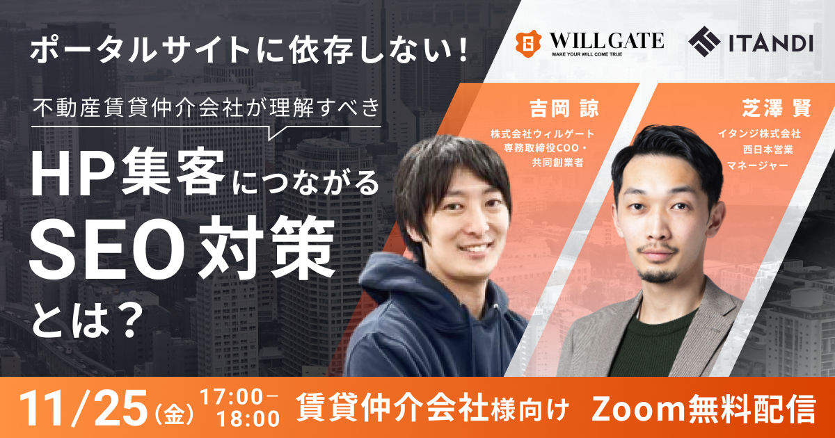 このニーズに応え、7,200社との取引実績とSEO研究チームを有するウィルゲート社と、累計利用者数600万人の賃貸顧客管理・自動物件提案システムを提供する当社は、合同で不動産仲介業の集客成功に必要なマーケティング施策「SEO対策」をテーマにした無料セミナーを開催することになりました。