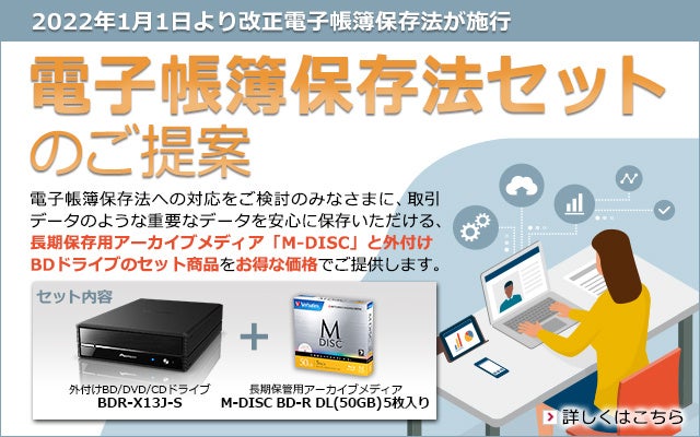 パイオニアITストアでは、電子帳簿保存法への対応を検討している方に、重要な書類やデータを安心に保存できる長期保存用光ディスク「M-DISC」と「パイオニア製外付けブルーレイドライブ」のセット商品を取り扱っています。