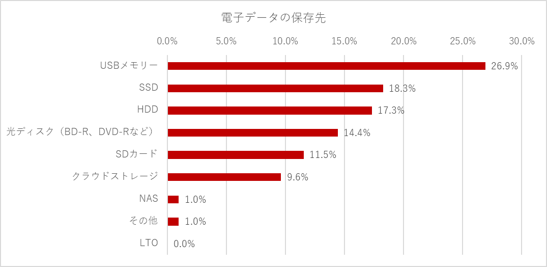 「USBメモリー」と回答した割合が26.9%と最も多く、次いで「SSD」18.3%、「HDD」17.3%となりました。