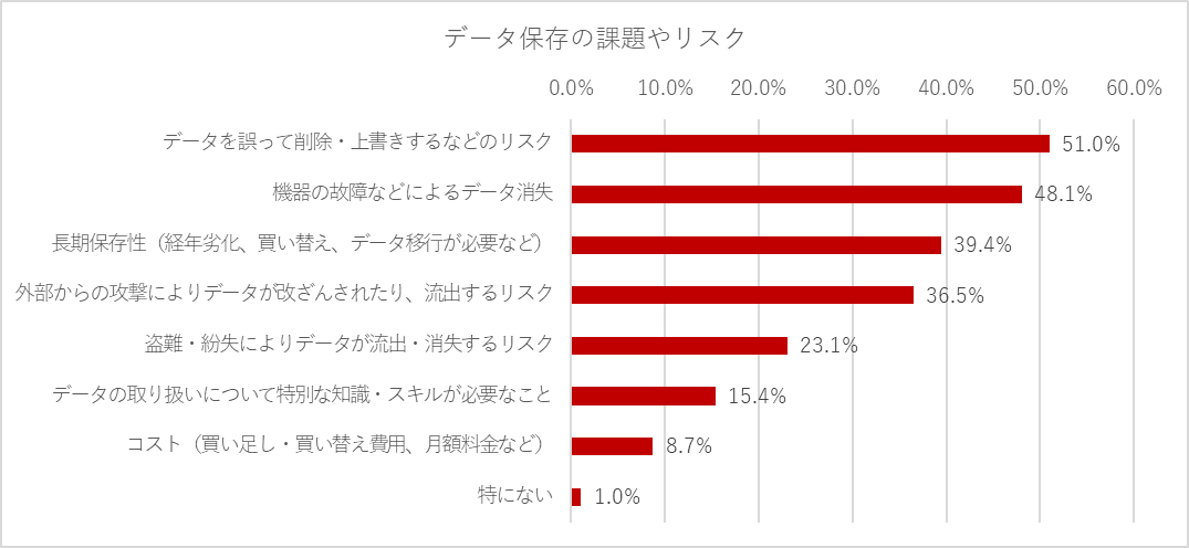 最も多かった回答が「データを誤って削除・上書きするなどのリスク」の51.0%、次いで「機器の故障などによるデータ消失」が48.1%、「長期保存性(経年劣化、買い替え、データ移行が必要など)」が39.4%という結果になりました。