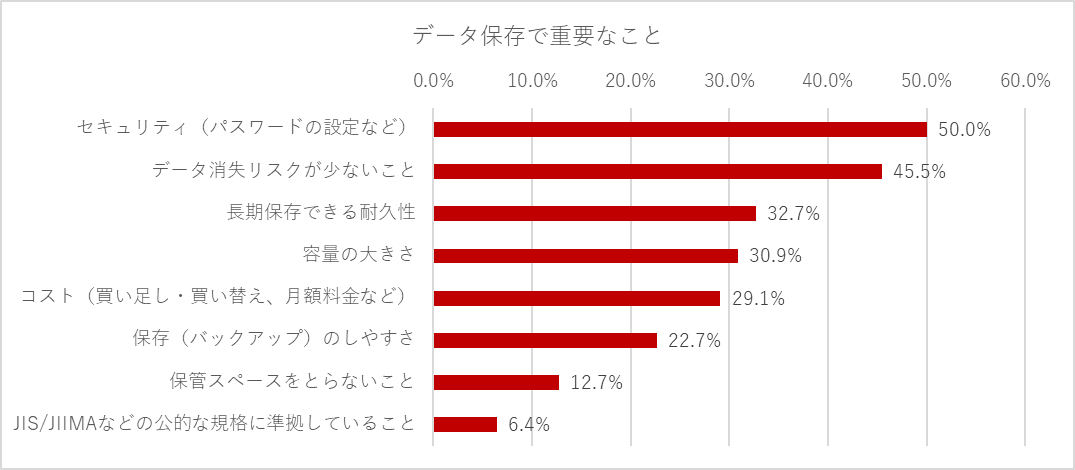 「セキュリティ(パスワードの設定など)」が50.0%で一番多く、次いで「データ消失リスクが少ないこと」が45.5%、「長期保存できる耐久性」が32.7%という結果になりました。