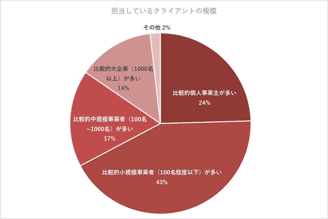 今回アンケート調査を行った税理士の方々は、個人事業主や小規模事業者など従業員数100名以下の企業をクライアントとしている方が最も多く、全体の半数以上の67%という結果となりました。