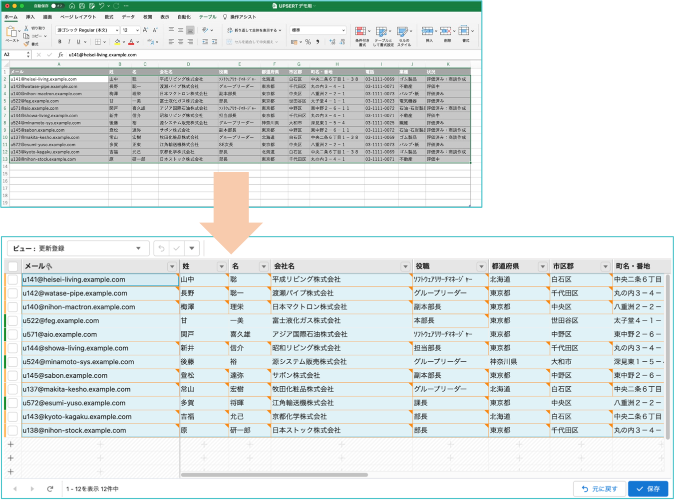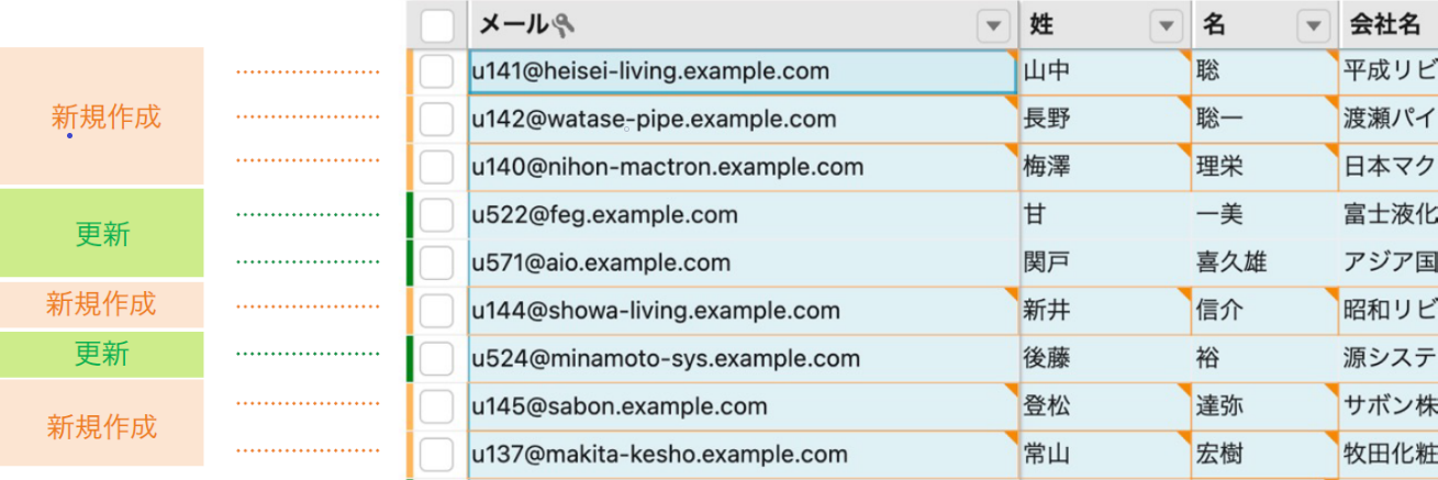 レコードを一意に特定できる列をキーに設定した上で、取込対象のExcelシートからデータを選択・コピーして、Mashmatrix Sheetにペーストすることで、取込対象データの行の順序や重複を気にすることなく、1回のコピー&ペーストだけで、新規レコードの作成と既存レコードの更新が同時に完了します。