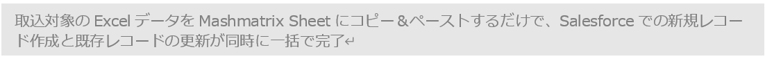 Mashmatrix Sheetでは、Excelで作成・管理されているデータをデータローダといった外部アプリを使用することなく、使い慣れたコピー&ペーストの簡単な操作だけでSalesforceに一括登録することができます。今回、このデータ取込時のコピー&ペースト機能において、レコードの更新挿入操作(UPSERT)に対応いたしました。