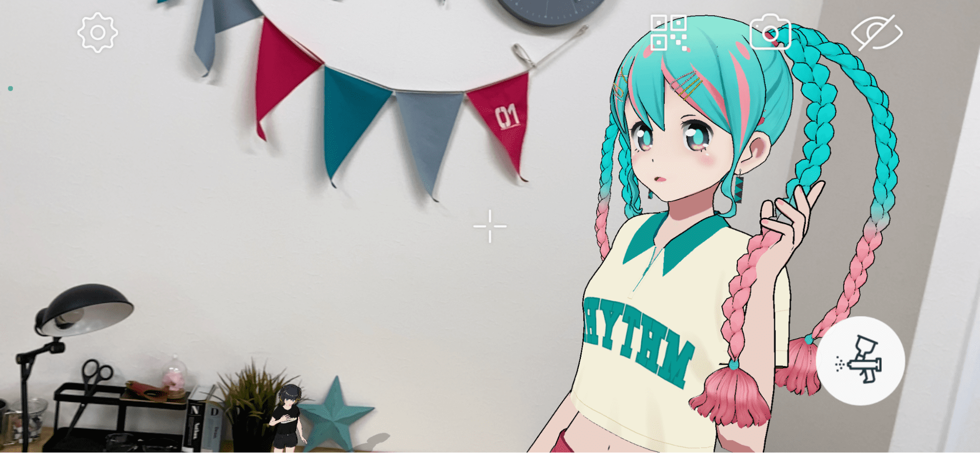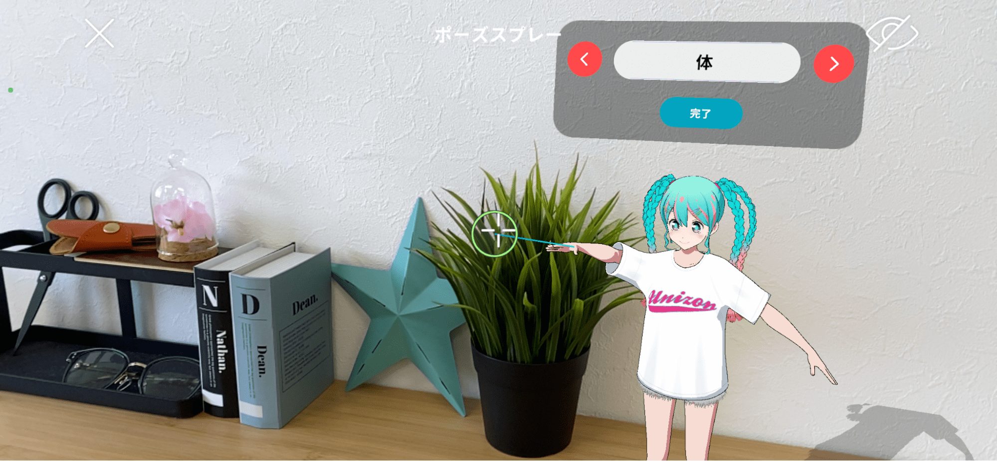 HoloModels(ホロモデル)のデジタルフィギュアは、デジタルスプレーを本体に吹きかけることで、さまざまな機能を使用することが可能です。画面上の「十」がカーソルとなるため、操作や選択の際は対象物にカーソルを合わせていただきますと、操作いただけます。