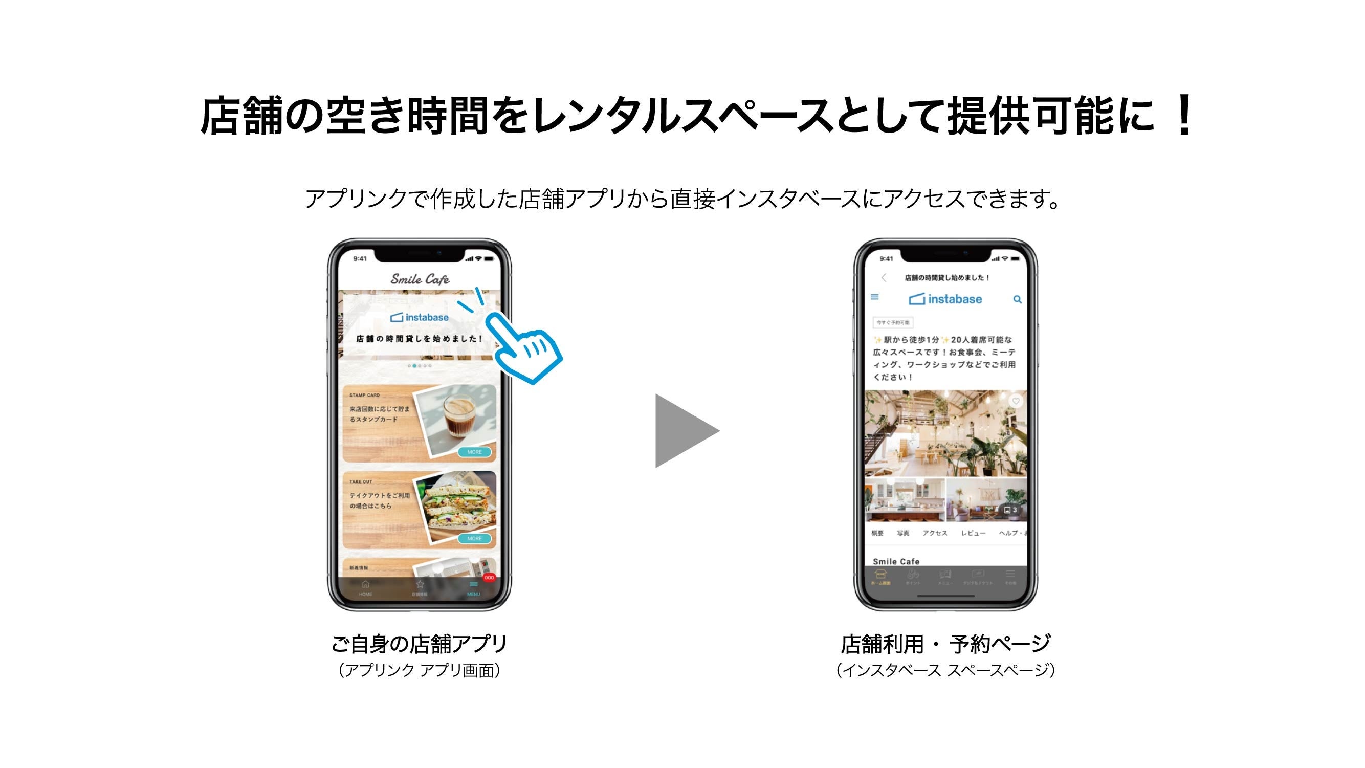 本連携は、インスタベースがアプリンクとサービス連携を行うことで、時間単位でその店舗の空き時間や空きスペースを、貸したい時に貸し出すことを可能にするものです。アプリンクにて店舗アプリを作成されたお店は、自身のお店をスペースページとしてインスタベースに掲載することができ、空き時間や空きスペースをレンタルスペースとして貸し出すことで、新たな収益チャネルを創出することができます。