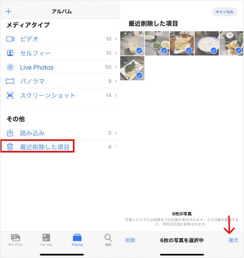 方法1:iPhoneの写真アプリで最近削除した項目から復元