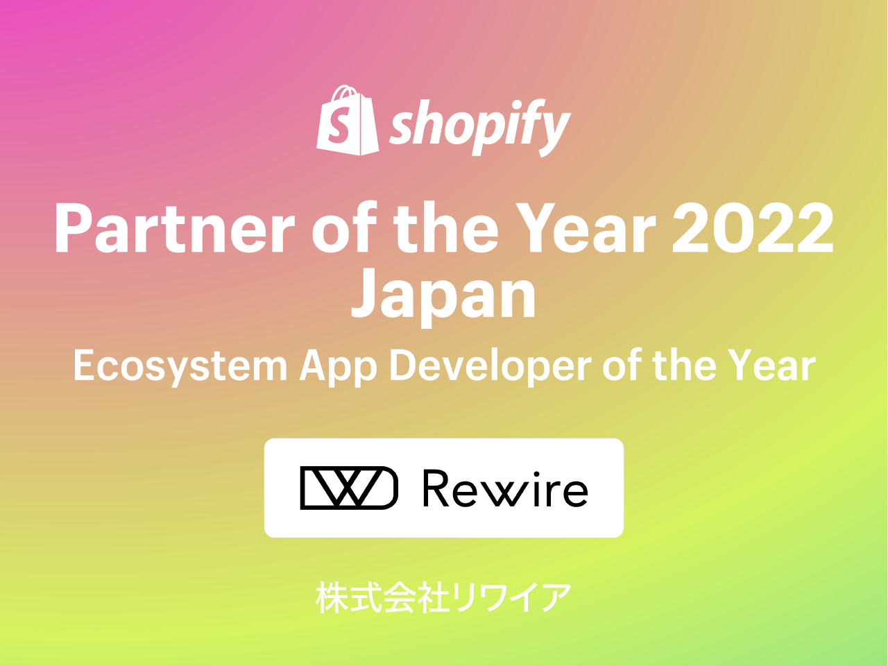 株式会社リワイアは、国内のマーチャントにその規模を問わず広く使われる、ポイント、およびアップセル、クロスセル用のアプリを提供し、またその開発で得た知見を惜しむことなくソーシャルメディアやオウンドメディアで発信、自社のみならず、他のパートナーへの貢献を含めたShopifyパートナーエコシステムの成長に寄与したことが評価されました。同社は、その他Shopifyの主催するイベントへの発信側としての参加や、国外からの最新情報のキャッチとシェアにも努め、自らがShopify開発者の日本におけるリーダー的な存在にもなっています。