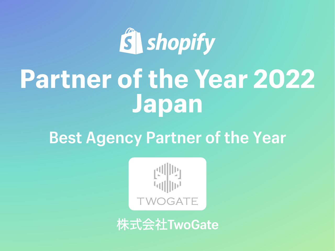 株式会社TwoGate(本社:東京都世田谷区/代表取締役:小林輝紀)は、2022年11月17日に、「Shopify(ショッピファイ)」の日本法人 Shopify Japan(本社:東京都渋谷区、日本カントリー・マネージャー:太原 真)が発表した2022年度最も活躍したパートナーを表彰するアワード「Partner of the Year 2022 Japan」において、数千社のパートナー企業から選ばれる「Best Agency Partner of the Year」を受賞したことをお知らせします。