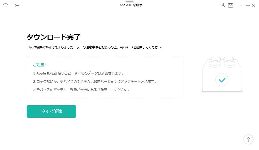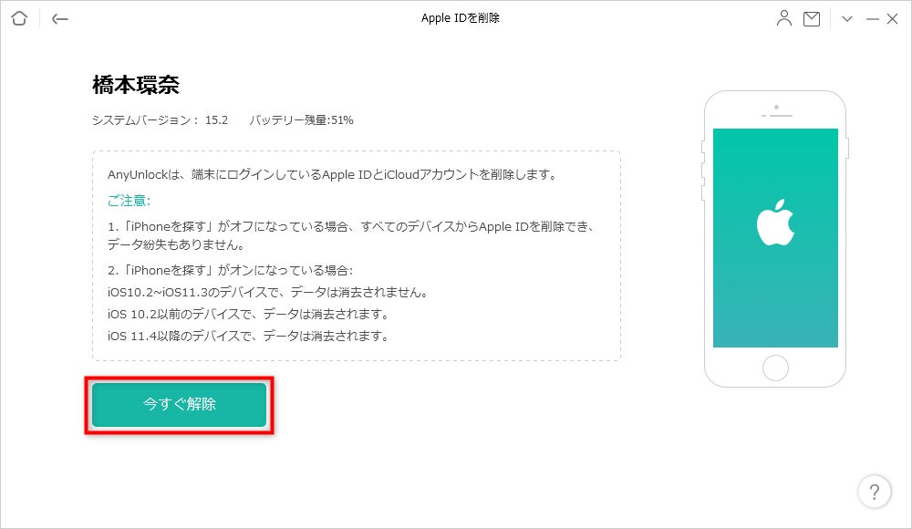 まずはAnyUnlockをダウンロードして起動します。ケーブルでデバイスをパソコンと接続し、「今すぐ解除」ボタンをクリックします。