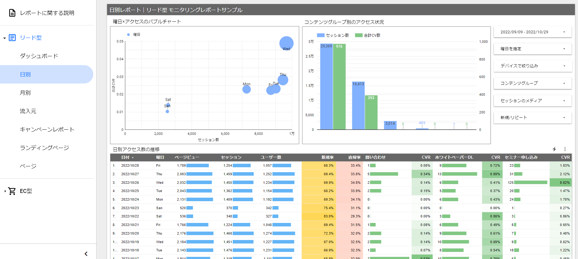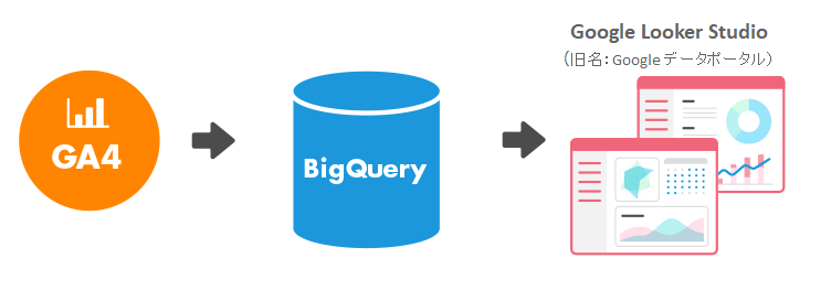 ※Google Looker Studio(旧名:Google データポータル)とは:Googleが提供するクラウド型のBIツールです。BigQueryやGoogle広告などの各種Googleサービスとシームレスに連携しデータを読み込むことができ、それらのデータを様々なグラフや表に柔軟にカスタマイズすることで、企業のマーケティング施策のレポーティングやダッシュボードとして活用することが出来ます。