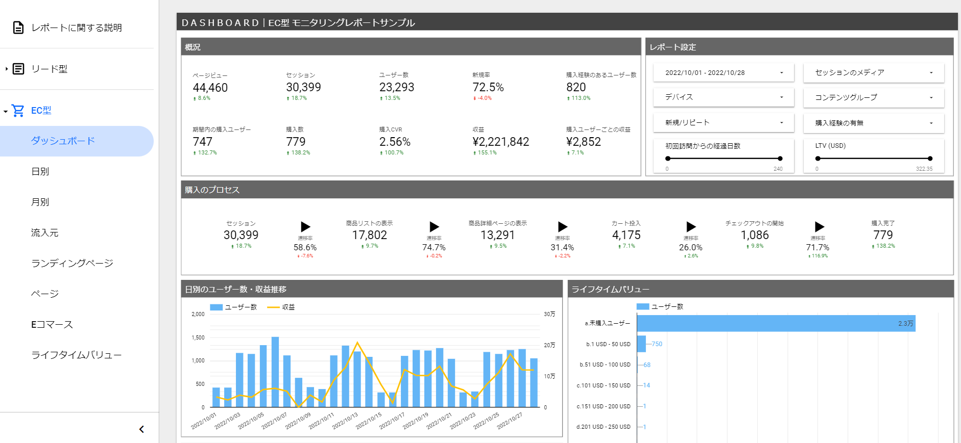 また、EC系/リード系それぞれの業種に合わせた標準のダッシュボード提供に加えて、企業のニーズに合わせた独自のダッシュボードをカスタマイズして構築いたしますので、UAで見ていたレポートをGA4環境下でも同じように表示したいというご要望にもお応えすることが可能です。