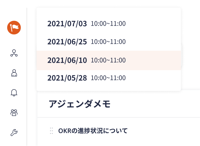 1on1中の画面から、過去の1on1議事録を一覧で見返すことができます。時系列で確認することができ、振り返りもカンタンに。1on1を実施した日時も記録されているため、いつのメモだったかがわからなくなってしまうことはありません。