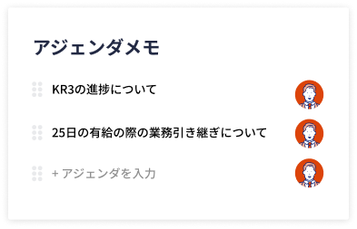 1on1で話したいことを、上司・部下双方から事前に登録しておくことができます。事前の情報共有があれば、1on1の時間をより有効的に活用することが可能に。話忘れや長時間化を防ぎます。