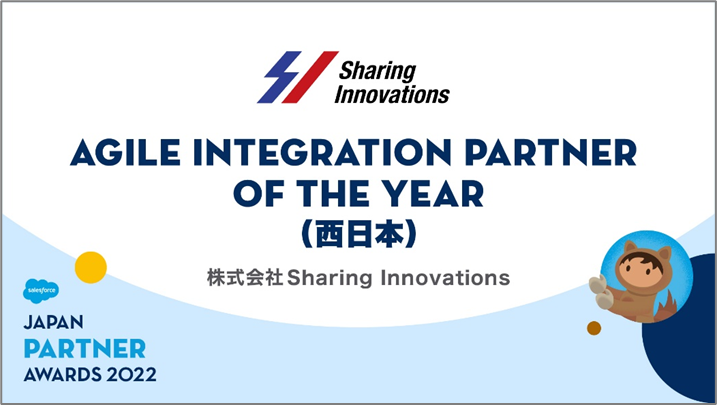 株式会社Sharing Innovations(本社:東京都渋谷区、代表取締役社長:飯田啓之、以下Sharing Innovations)は、株式会社セールスフォース・ジャパンの西日本パートナー会2022において「Agile Integration Partner of the Year」を受賞いたしました。