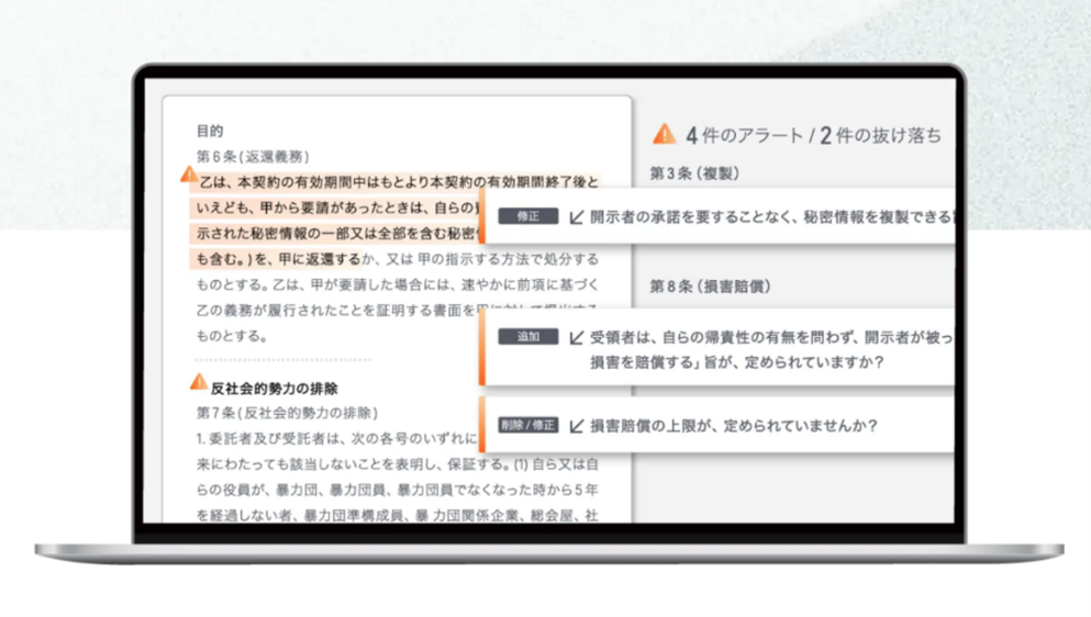 「LegalForce」は、最先端のAI技術と弁護士の法務知見を組み合わせたAI契約審査プラットフォームです。自然言語処理等の技術を活用し、契約類型別のチェックリストと契約書の照合を自動的に行います。契約書をアップロードするだけで契約リスクや条項の抜け漏れの洗い出しをサポート。そのほかリサーチ、編集、案件管理などの契約審査業務をワンストップでサポートします。ナレッジの蓄積や共有も可能で、業務の属人化を防ぎます。