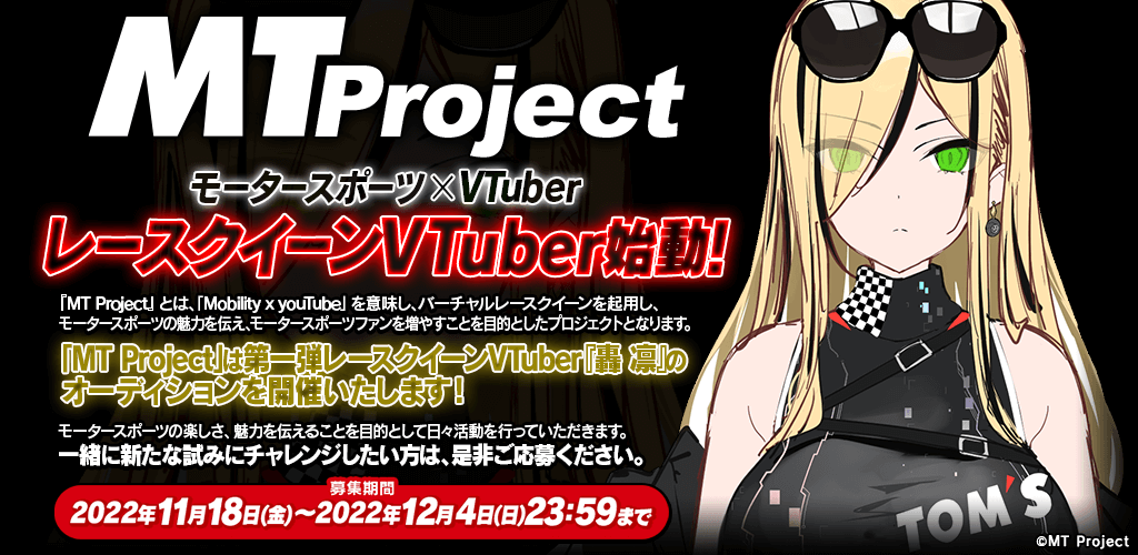 『MTプロジェクト』とは、「Mobility x YouTube」を意味し、バーチャルレースクイーンを起用しモータースポーツの魅力を伝え、モータースポーツファンを増やすことを目的としたプロジェクトとなります。