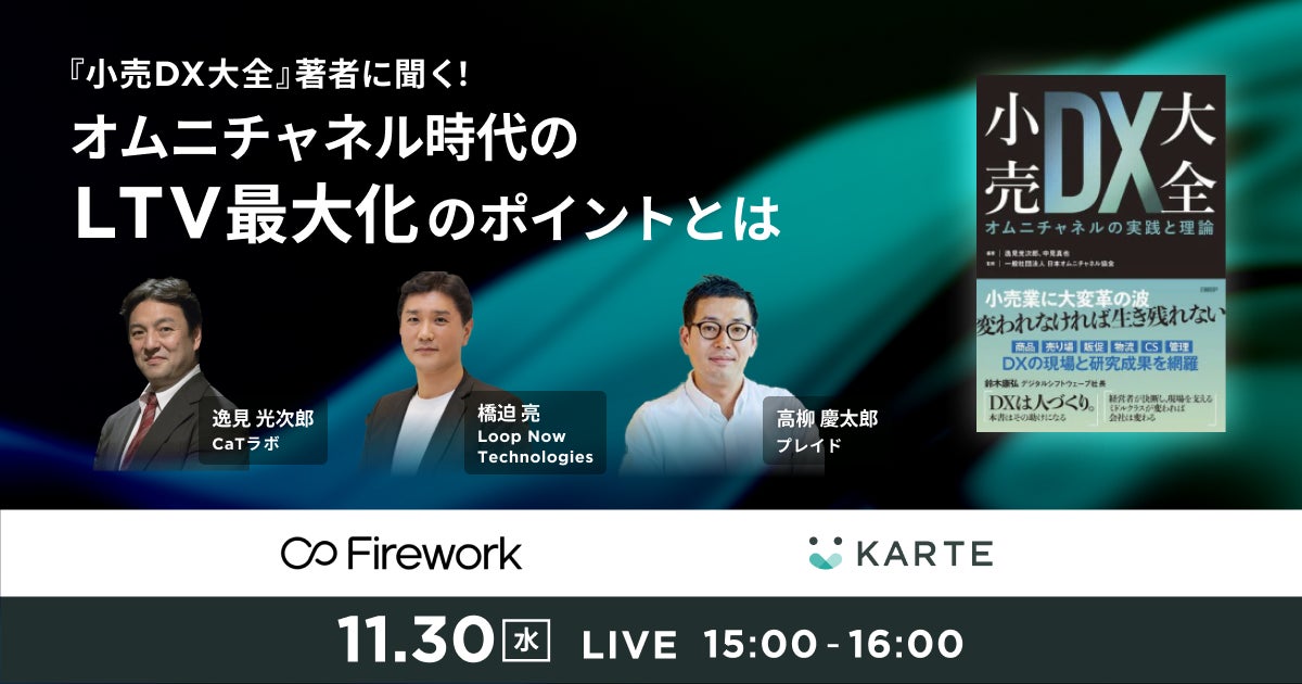またオムニチャネル戦略を考える上で重要度が増している自社EC強化ツールとして、Firework、KARTEでのデータ活用最新事例もご紹介します。自社のオムニチャネル戦略を見直すヒントが見つかるセミナーに、ぜひご参加ください。