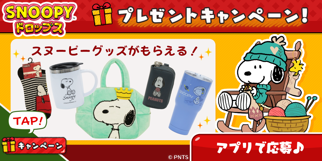 2022年11月18日(金)から開催する、ゲーム内イベント「あみものダンジョン」に参加すると応募できる、プレゼントキャンペーンを開催!とってもかわいいスヌーピーグッズが抽選で当たるよ!この機会をお見逃しなく♪