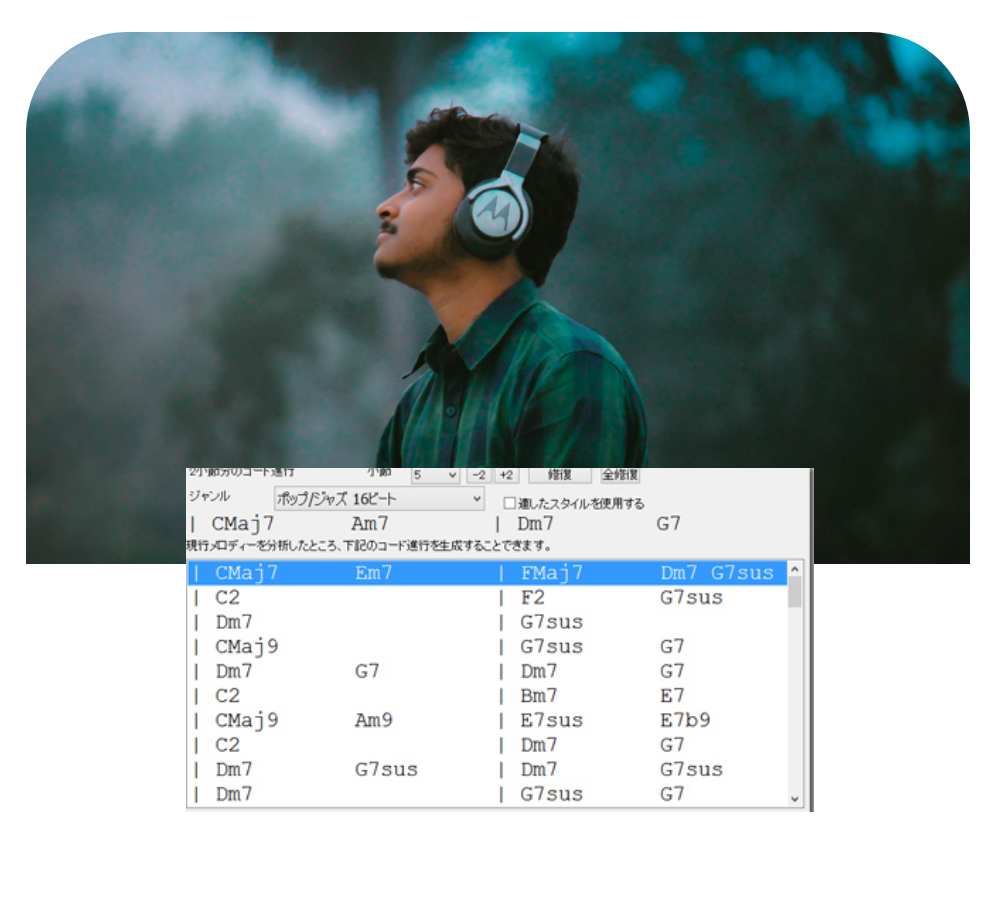 好みのジャンルやテンポなど、項目を選択するだけで、コード生成アルゴリズムがジャンルに沿ったコード進行を自動作成!