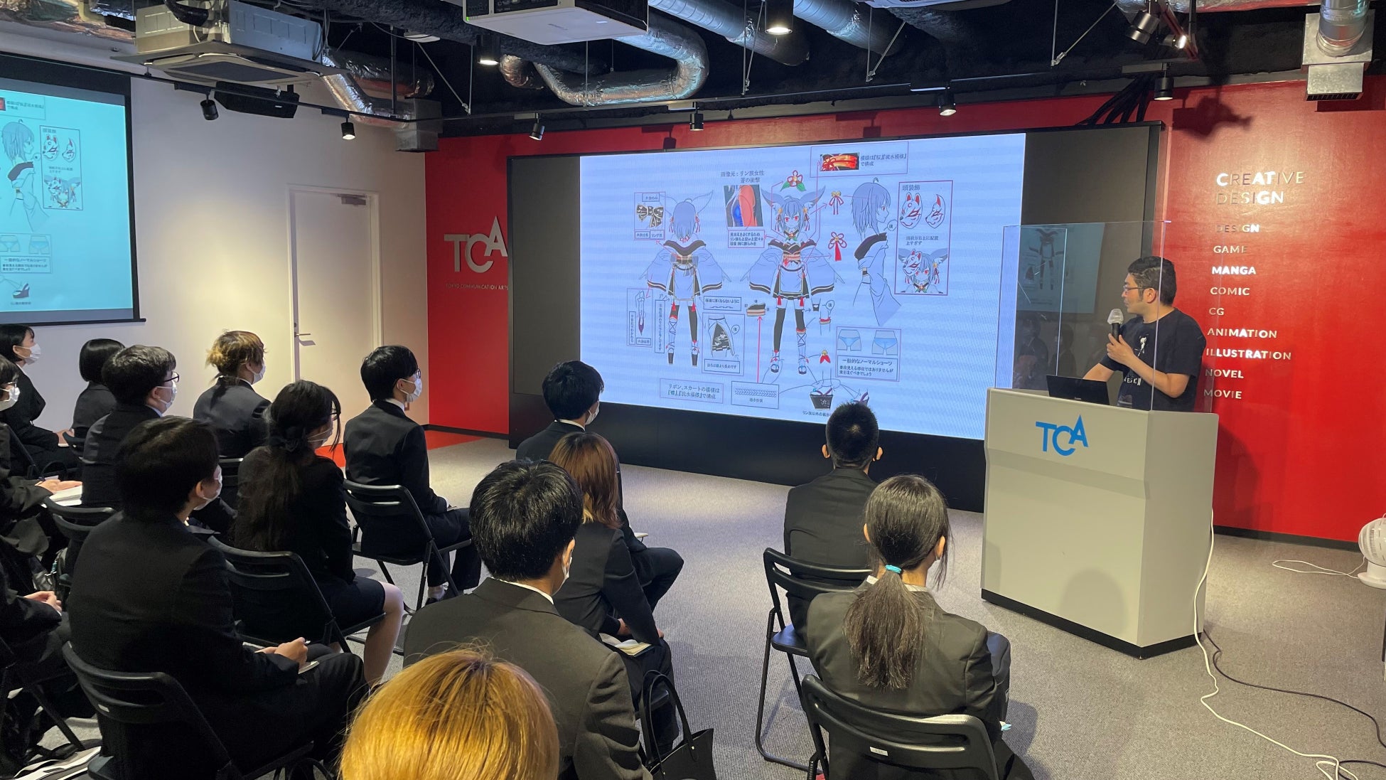 今回、TCA「東京コミュニケーションアート専門学校」と共同で産学連携プロジェクトを実施するにあたり、7月22日(金)に、東京コミュニケーションアート専門学校内にて、『リネージュ2』統括プロデューサーの新井友和が、学生の方々に向け今回の産学連携プロジェクトについて説明会を実施しました。