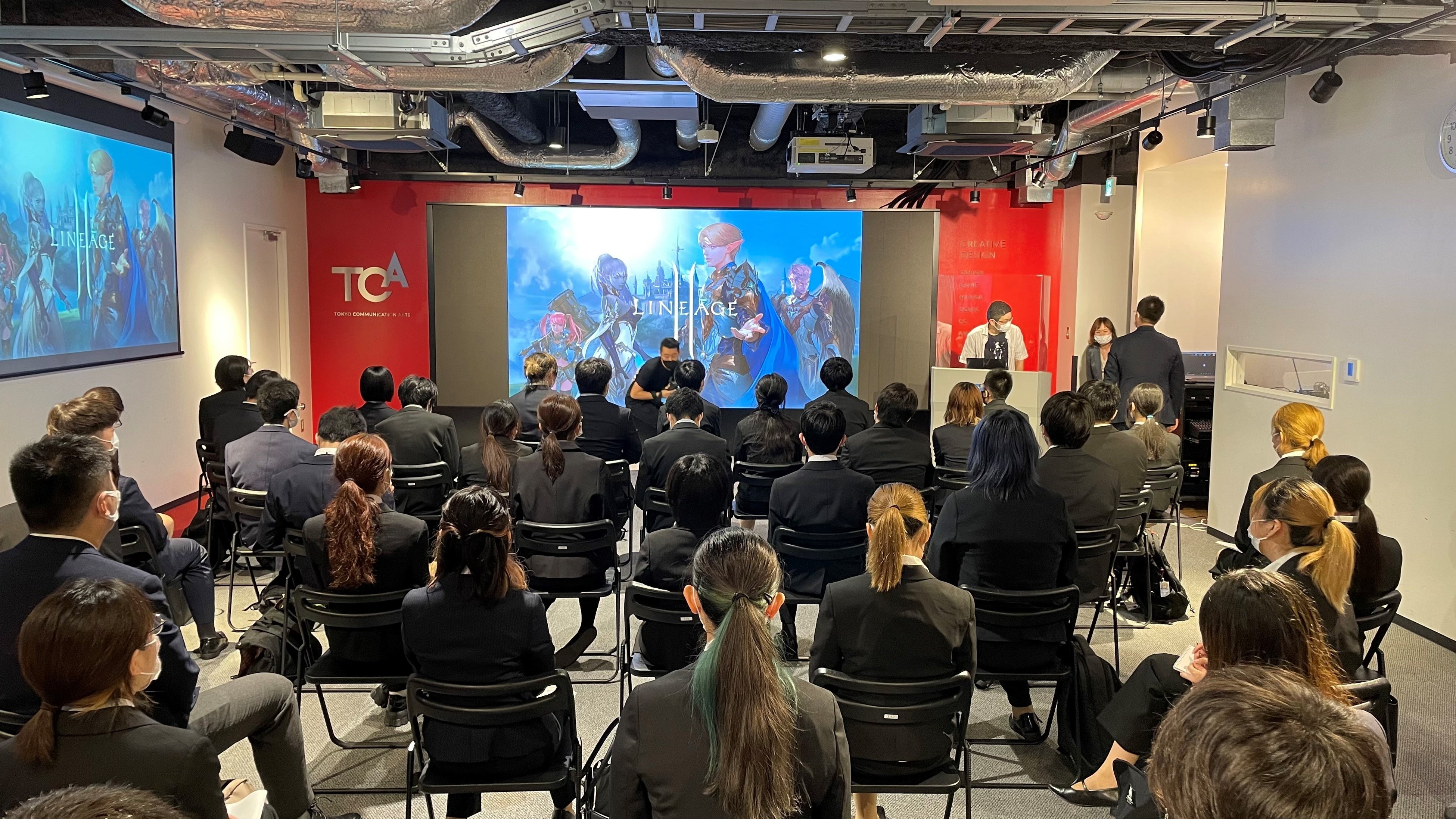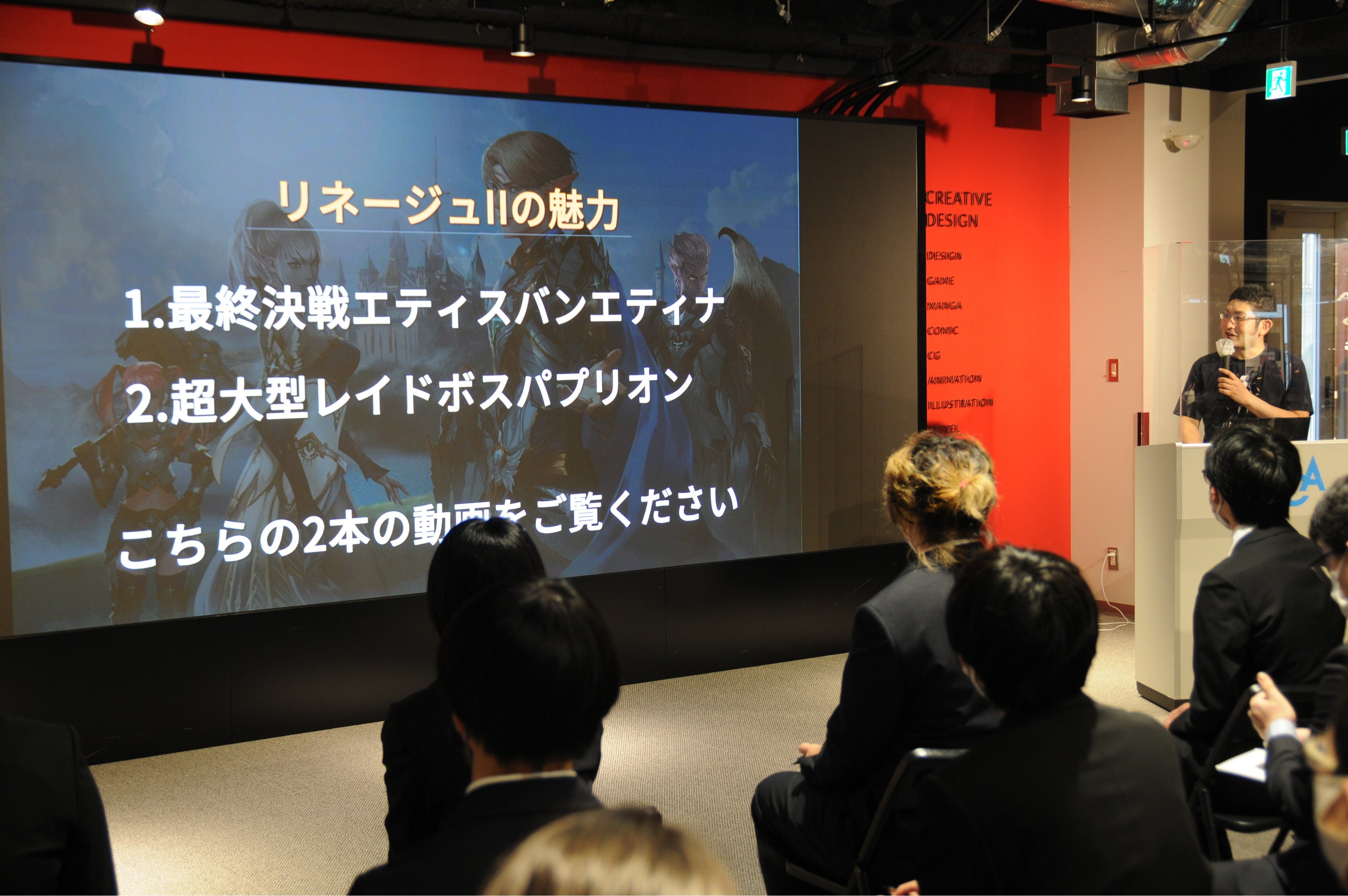 今回、TCA「東京コミュニケーションアート専門学校」と共同で産学連携プロジェクトを実施するにあたり、7月22日(金)に、東京コミュニケーションアート専門学校内にて、『リネージュ2』統括プロデューサーの新井友和が、学生の方々に向け今回の産学連携プロジェクトについて説明会を実施しました。