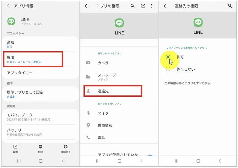 Step2:「権限」>「連絡先」の順にタップして、「許可しない」にチェックが入っている場合には、「許可」にチェックを入れます。