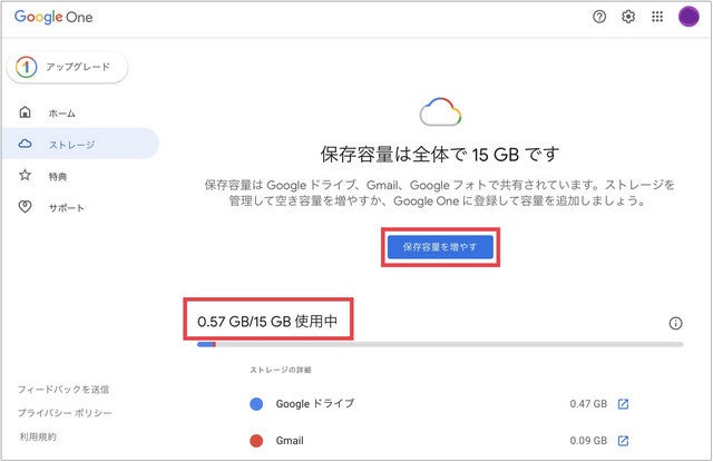 Step1、Google One(https://one.google.com/)にログインして、「ストレージ」の項目から使用中のGoogle ドライブの容量を確認しましょう。