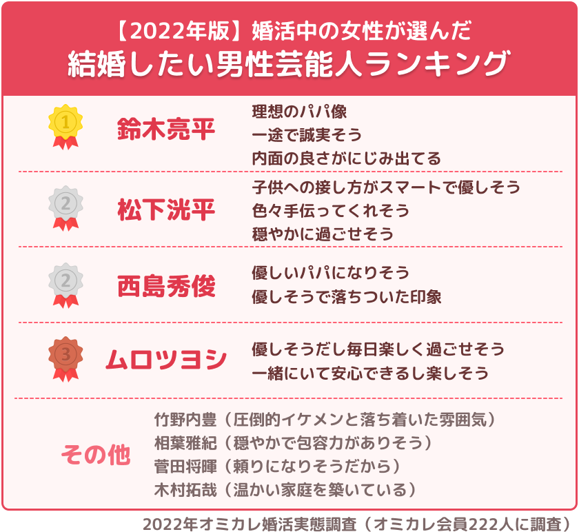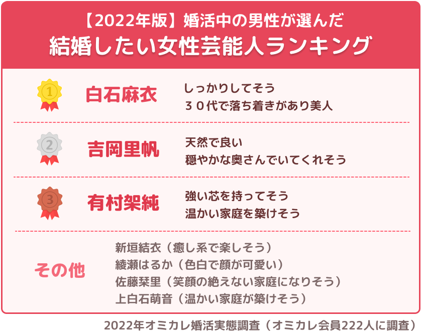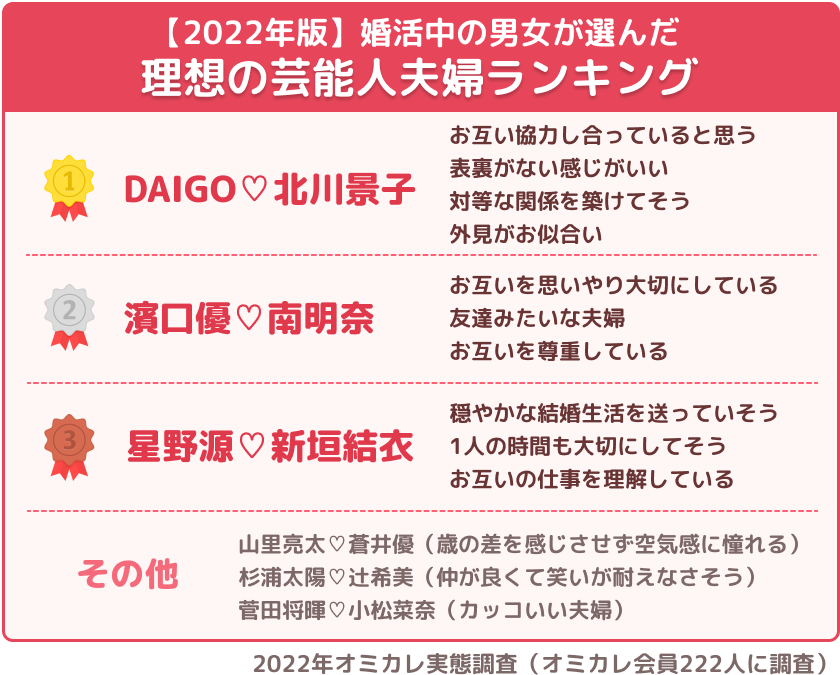 昨年に引き続き『理想の芸能人夫婦』の他に「恋人にしたい芸能人」「結婚したい芸能人」についてもアンケートを実施いたしました。コロナ禍でも婚活を継続している男女222人から回答を得ましたので、【2022年版】の結果をご報告いたします。