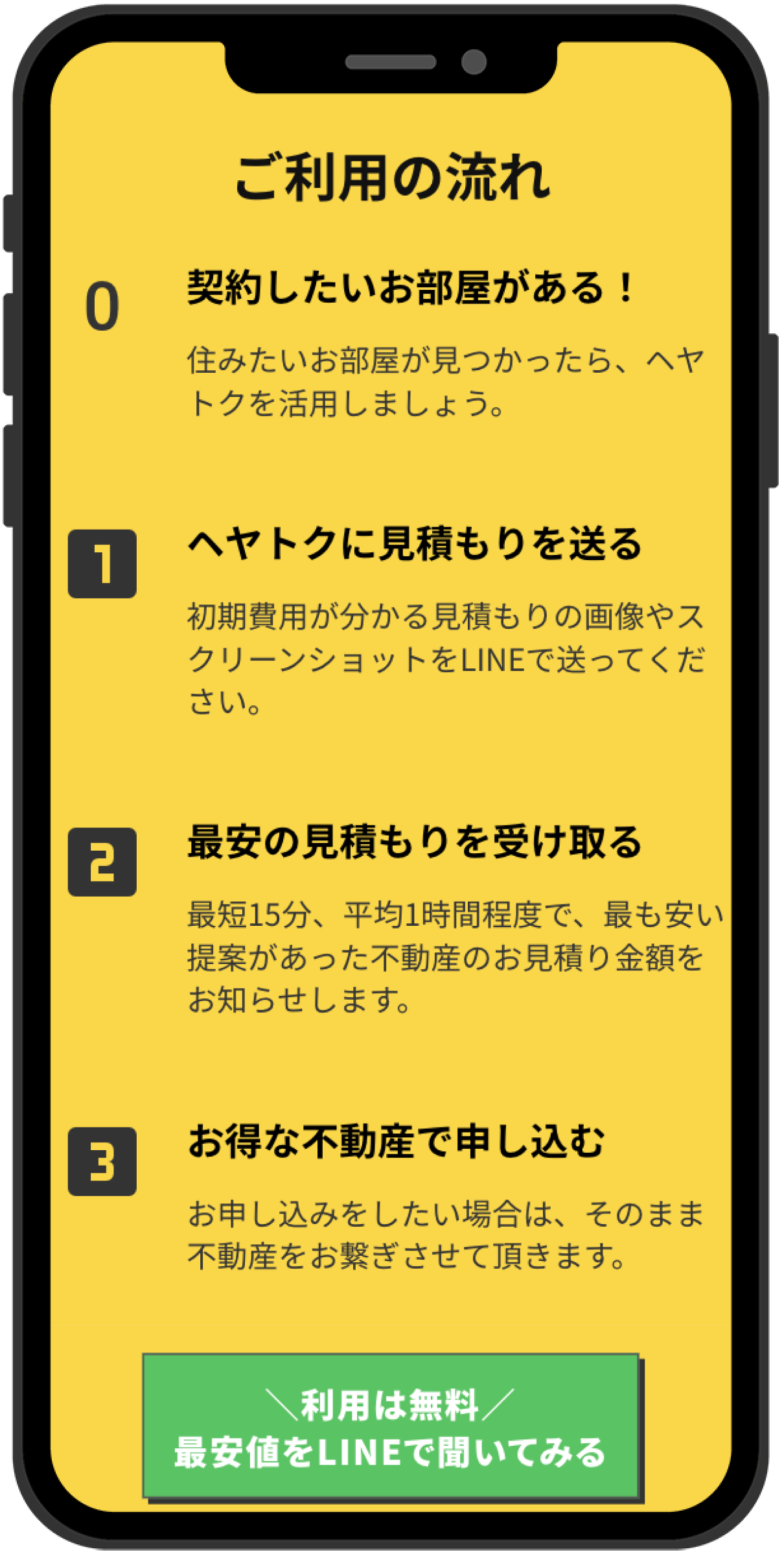 ヘヤトクのご利用にあたり、お名前や電話番号の入力などは不要です。お申し込み前のお部屋の初期費用が分かるお見積もり画像やスクリーンショットをLINEで送るだけで、ヘヤトクが最安値をお調べいたします。そのため不動産からの営業連絡なども来ませんのでご安心ください。