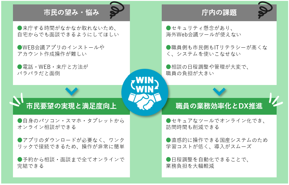 本研究では老若男女問わず容易に使えるセキュアな商談システムである「ROOMS」を活用し、職員の事務処理に要する時間の測定や、利用者アンケートなどを通じて「市民サービス向上」と「庁内業務改善」の効果検証を行い、市民の要望実現と市職員の業務改善、双方がWin‐Winとなる相談インフラの創出を目指します。