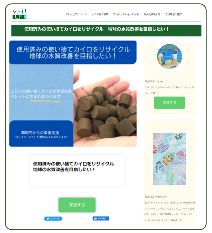 VAIABLE は、WEB3型クラウドファンディングサービス「VAI!UP」(旧称 VAI!クラウドファンディング) を提供し、直接的なプロダクト購入が目的ではない社会課題解決型プロジェクトに対し、返礼品にアート作品・NFTを活用頂くことで、社会課題解決の推進を目指しています。
