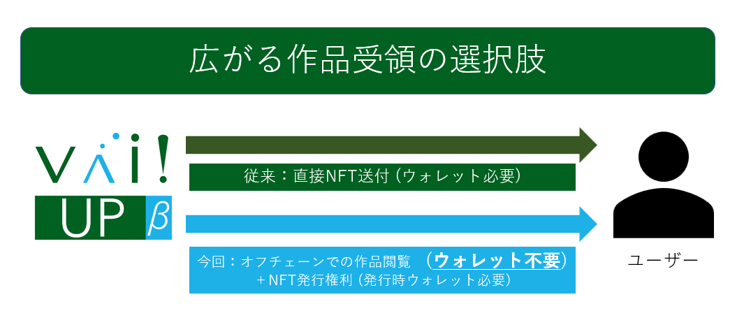 これまで「VAI!UP」では、ユーザーとプロジェクト起案者双方のWEB3サービス参加を容易とするため、暗号資産不要で現金決済を可能とするサービス等を提供してきましたが、ユーザー側のソフトウェアウォレット作成の手間は残っていました。